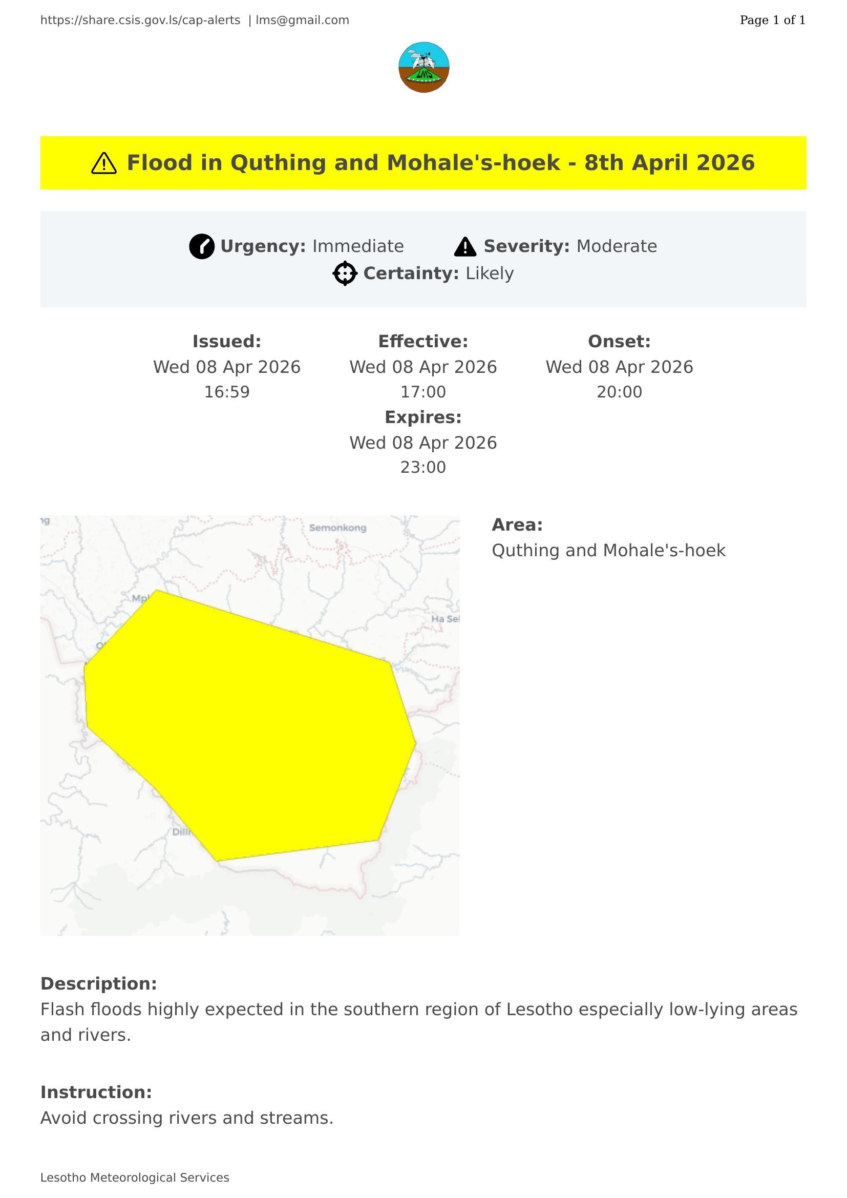 Flash floods highly expected in the southern region of Lesotho especially low-lying areas and rivers.