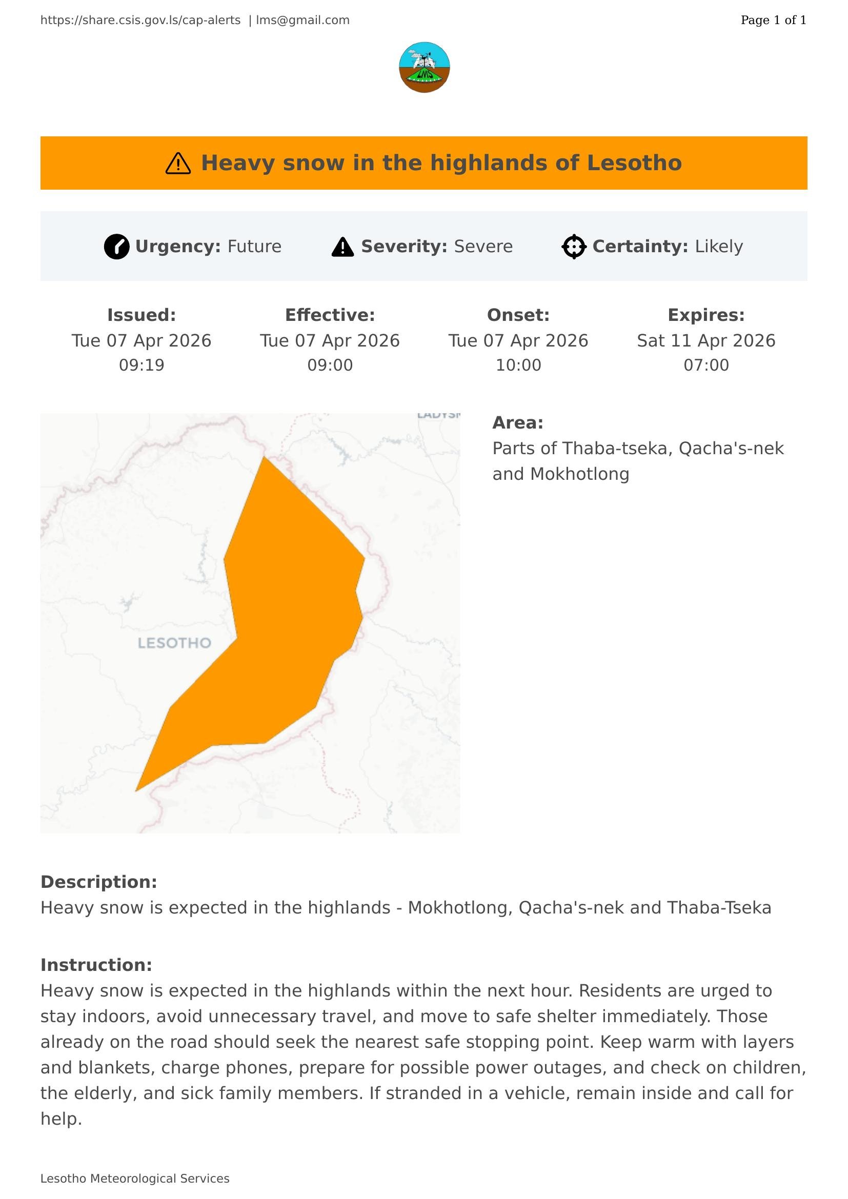 Heavy snow is expected in the highlands - Mokhotlong, Qacha's-nek and Thaba-Tseka