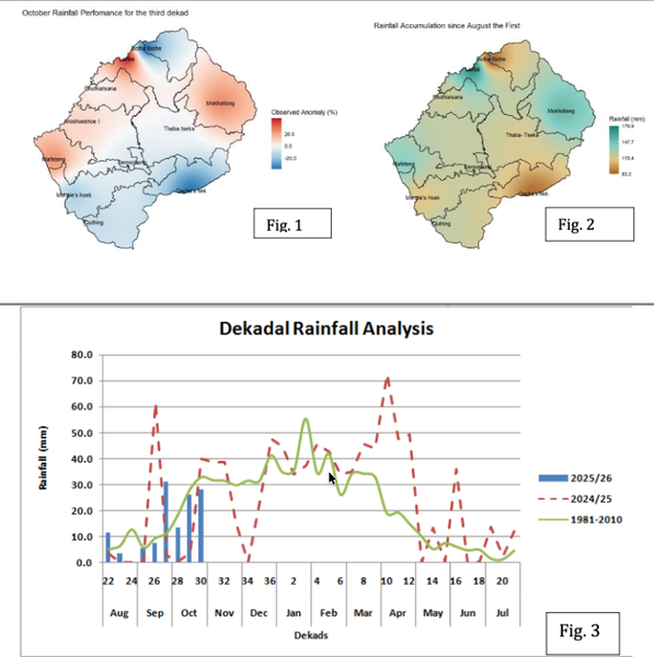 The rainfall performance for third dekad of October 2025 shows a mixed pattern across the country (Fig 1), confirming a distinct spatial difference in recent moisture availability. Areas to the west (Leribe through to Mafeteng) and east (Mokhotlong) display near- normal to above -normal rainfall (Fig 1). Areas in the south (Mohale’s hoek and Quthing and north (Botha-Bothe) show negative (below normal) anomalies shown. This is evident from rainfall accumulation since the start of the season in August shown in Fig.2. For example, in the same period, Mokhotlong recorded 153,3mm against the long term of 120,7mm, while in the north Botha-Bothe observed 80,5mm compared to a normal of 130,5mm.